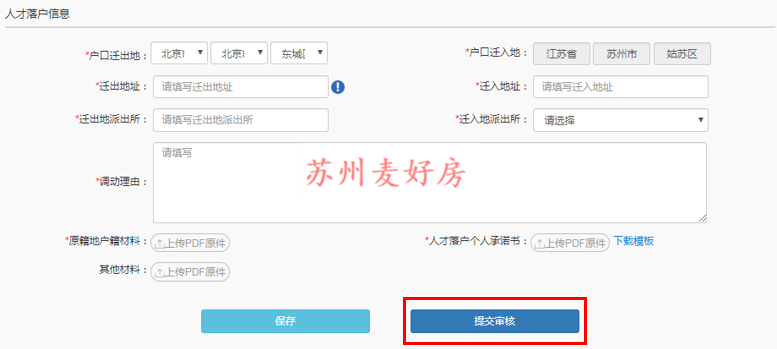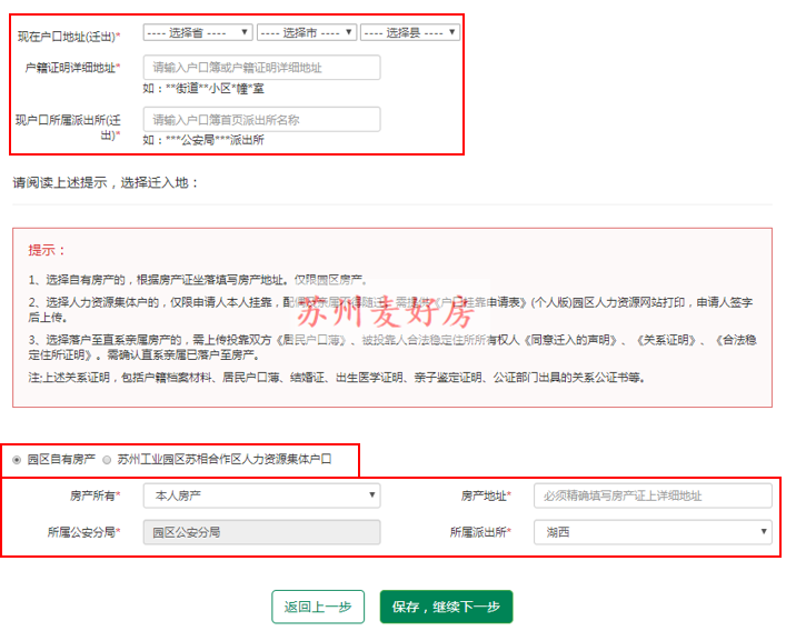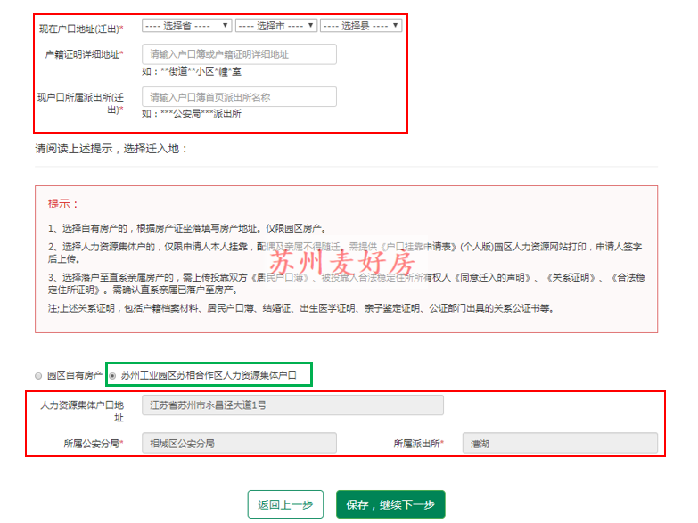 第八步:户口迁出地址信息填写,以户口本上为准,注意这一条内容分为两种,一种是园区自有房产,另外一个是苏州工业园区苏相合作区人力资源集体户口,申请时一定看清。