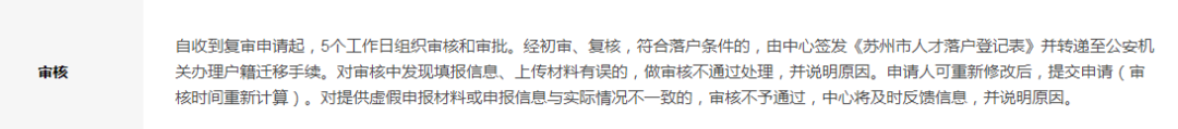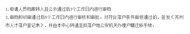 待档案调入吴中区人管中心、公示完毕且无任何异议后,中心工作人员将在5个工作日内,组织审核和审批。对初审、复核,符合落户条件的,中心负责人同意后签发《苏州市人才落户登记表》(此表格,中心会根据个人所填的申请信息自动生成,无需下载上传),并连同你的落户信息一起转递至拟落户地公安机关。
