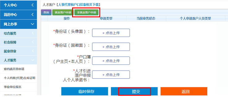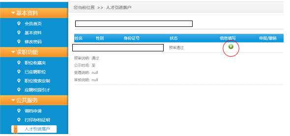 第八步:个人申报信息预审,同样是3个工作日,预审通过后登陆一站式服务系统,在线申请档案调入,如下图所示。