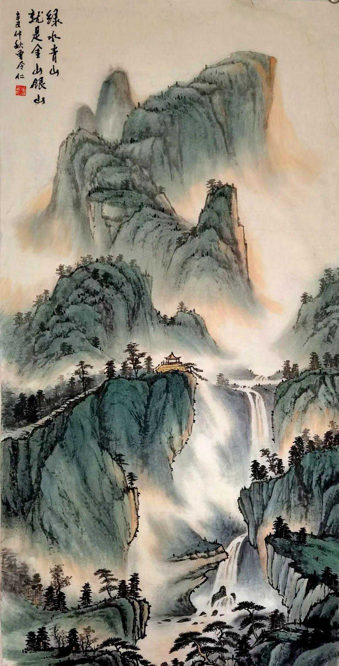 在曾令仁先生的山水作品里游目骋怀,总有色不碍墨,墨不碍色的层次分明。一天清淑气,万里碧榆风,无论是用水墨还是用青绿进行画面渲染,都是干净如水洗过一般,纤尘不染,画得明心见性。以水为道,以墨为器,把最简约的材料结构出传统审美的玄机要妙。以青为雅,以绿为韵,青绿生动而自然,最可以画得春水满四泽,夏云多奇峰。细腻爽约的色彩魅力,总是让人感觉赏心悦目。东崖复沓蔽轻雾,西峰峥嵘喷流泉。风行雨霁,百尺悬瀑。心画山水沉醉在青山绿水之间,结晶出诗意印象,充盈着词的美好。