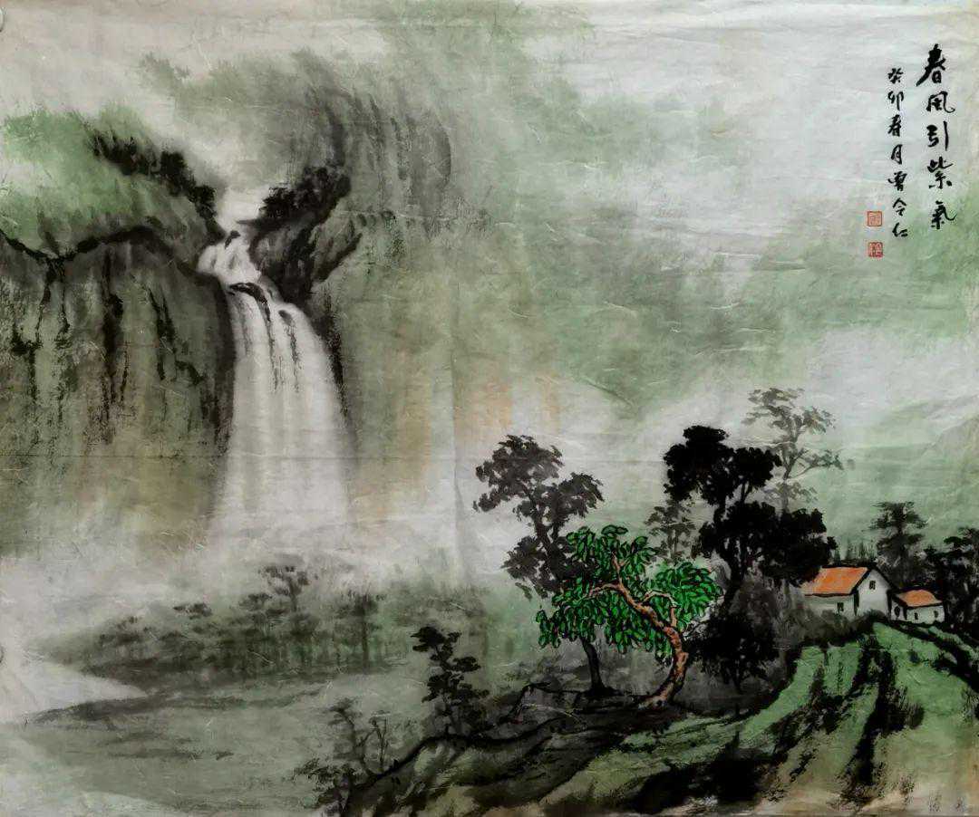 曾令仁先生历练山水画法,有精研覃思一丝不苟的执着,首先有骨法用笔的精气神。从《青山绿水》看到《惠风和畅》,件件山水作品都相当讲究线条塑造的畅滑与劲健。起笔落点准确无误,运笔不偏不倚,长线一气呵成,短线顿挫有效。在对境造意的过程中,可以把中国画依线条而造型的功夫发挥的无以复加。短线长线组织的相当有秩序,不让一笔拖泥带水,不让一根线条成为散兵游勇。所以无论是远观其山水,还是在近处细细观看其山水,总是有无可挑剔的笔法精练,专业水准处于极高的段位。每一件山水作品都有取法为上的示范价值,也有可以习为画谱的学术效应。