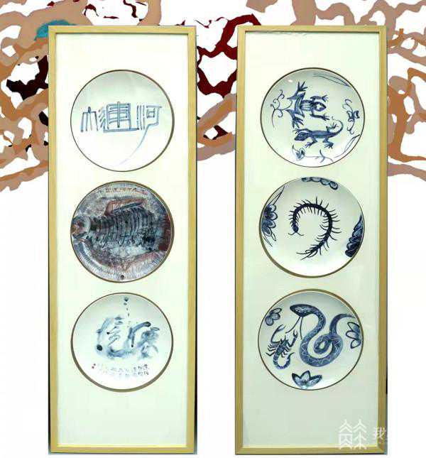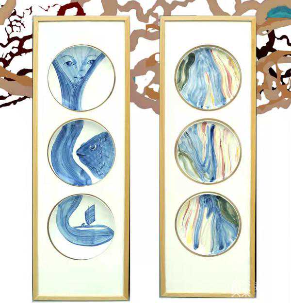 郑秋老师说:“这个盘子本身是有残缺的,这儿有个缺口,然后我就利用残缺把它作为鱼嘴的部分,然后利用鱼嘴的部分进行拓展设计,把它画成既像船又像鱼,边缘是波光粼粼的整体的一个造型,着色方面主要以棕色和我们的复古青花为主要色调。”