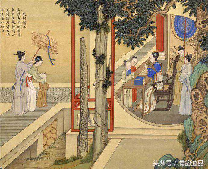 【教训诸王】此图人物典出《后汉书?马后纪》载:“建初元年,欲封爵诸舅,太后不听,帝复重请,太后报曰:“吾反复念之,思令两善,岂徒欲获谦谦之名,使帝受不外施之嫌哉!夫至孝之行,安亲为上,吾素刚急,有胸中气,不可不顺也。若阴阳调和,边境清静,然后行子之志,吾但当含饴弄孙,不能复关政矣!又置织室,蚕于濯龙中,数往观视,以为娱乐。常与帝旦夕言道政事,及教授诸小王《论语》经书。”的故事。