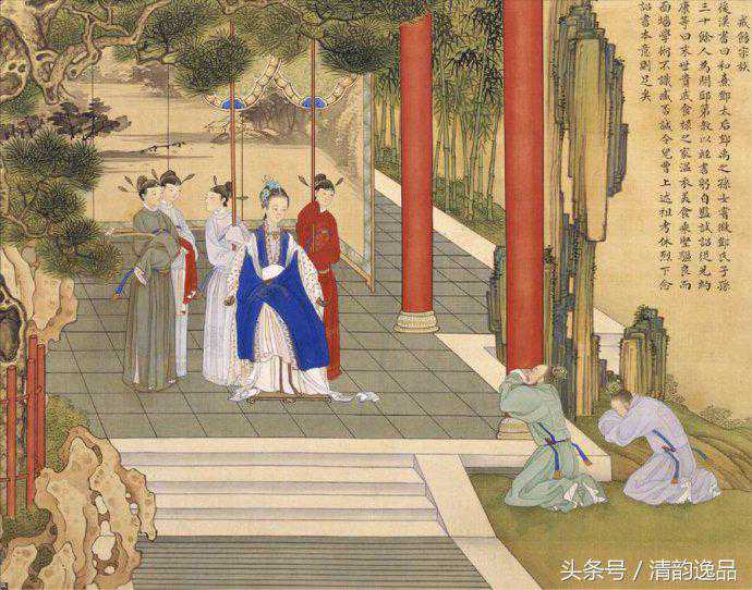 【戒饬宗族】此图人物典出《后汉书》卷十上皇后纪第十:“和熹邓皇后讳绥,太傅禹之孙也。父训,护羌校尉;母阴氏,光烈皇后从弟女也。后任太后,邓太后诏征和帝弟济北、河间王子男女年五岁以上四十余人,又邓氏近亲子孙三十余人,并为开邸第,教学经书,躬自监试。尚幼者,使置师保,朝夕入宫,抚循诏导,恩爱甚渥。”的故事。
