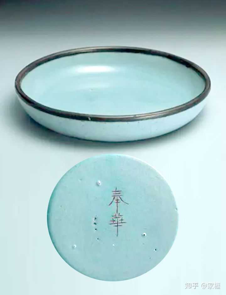 台北故宫博物院藏汝窑青瓷盘底部也刻有“奉华”二字,这两种刻字刀法、结构相同,应该是十二、十三世纪刻上去的可能性比较大,因为“奉华”二字写法较为自然,比较接近原刻款,这是用刻玉工具直接刻的,没有修饰的痕迹,刻在器物的底部中心,也没有给乾隆皇帝留出刻御题诗的地方,显然不是乾隆时期所为,因此推理应该不是乾隆时期的刻款。