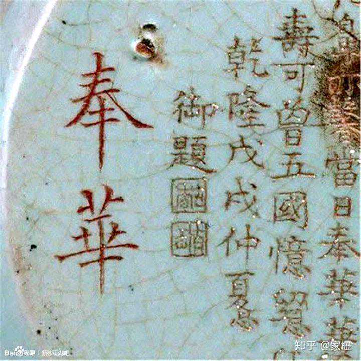 还有一部分应该是乾隆在心爱的瓷器上刻御题诗时刻上去的,乾隆诗曰:“定州白恶有芒形,特命汝州陶嫩青。口欲其坚铜以锁,底完而旧铁余钉。合因点笔意为静,便不簪花鼻亦馨。当日奉华陪德寿,可曾五国亿留停。乾隆戊午仲夏御题(1738年)”钤“古香”“趙”二方章。这首诗的左面刻有“奉华”二字,首先看看这字体是仿宋体,暗示它是宋徽宗时期的器物,再看看布局是明显的让出御题诗而特意刻在左侧,这样的布局是明显安排好的,而绝不可能宋代预留出来给乾隆刻御题诗的空间,“奉华”二字的仿宋体也是明显暗示年代,其实原刻款和宋、金后刻款都是很随意的自然直线刻上去的,并不是按宋徽宗的瘦金体刻的,这件按宋徽宗的书体刻的显然是“画蛇添足”了。