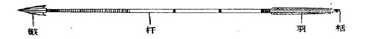 箭主要由箭镞、箭杆、箭羽、栝组成,箭最具有杀伤力的部位就是前段的锋刃,主要由竹、木、骨、石、青铜、铁等材料制成,称为箭镞。箭镞因为材质有利于长期保持,在考古中多有发现。