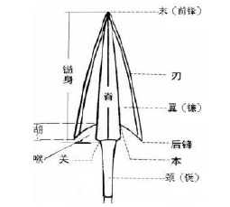 完整的箭镞包括前锋、刃、脊、关、翼、后锋、本、喉、胡等部位。