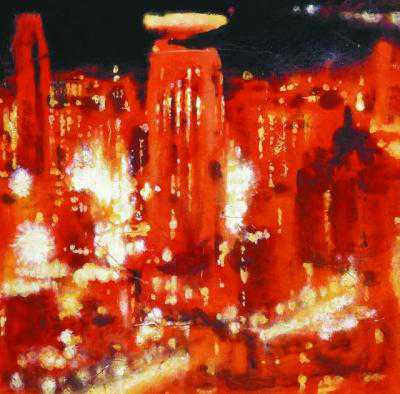 靳之林的《1954年的国庆节》用表现性极强的语言,提炼概括的笔触,勾勒出天安门前欢庆的人群,与天安门外轮廓的灯光、天上飘飞的焰火一起,表现了五彩斑斓的国庆夜。陈石濑的油画作品《国庆之夜》,表现的也是夜景,远处的橙色烟花作为深调画面中的一个明亮的团块,衬托出中景逆光建筑群,画面简约。张敏杰的油画《公元1949》,欢呼的人群高举的旗帜涌向画面的左上方,人群行进方向的“势”所形成的指向性,将左上方天安门变成“画眼”部分,巧妙地彰显了主题。