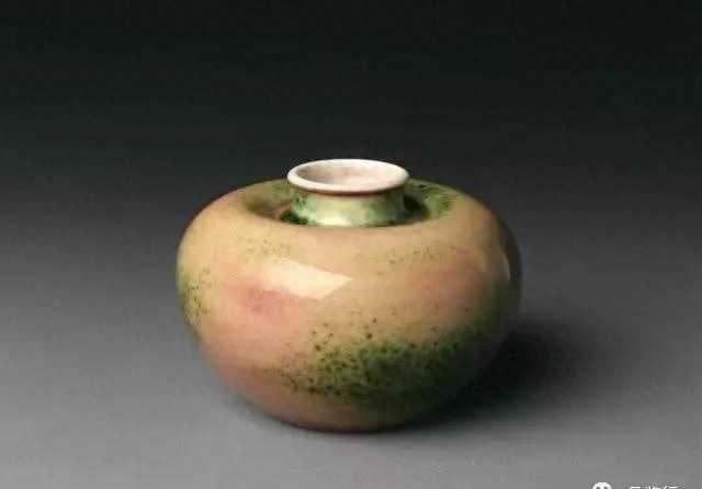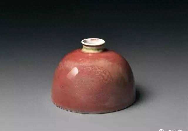 【镗锣洗】镗锣洗为清中期典型宫廷文房用具。因其形似镗锣而得名。此洗敛口,矮扁腹,浅圈足。造型小巧精致,线条流畅。内壁、外底部施白釉,外壁施豇豆红釉,娇艳粉嫩,釉面光洁明亮,玻璃质感强,宛如豇豆之红色。