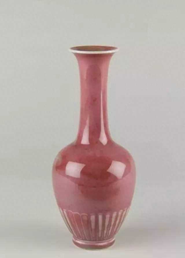【菊瓣瓶】瓶撇口,细长颈,圆肩,肩下渐收,圈足。因近底处凸雕一周细长的菊瓣纹,故称菊瓣瓶。通体施豇豆红釉,釉色滋润淡雅,呈现出深浅变化的粉红色,其间夹杂少许绿色苔点。口沿露白色胎骨。底部施白釉,署青花“大清康熙年制”六字款。
