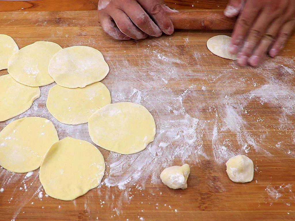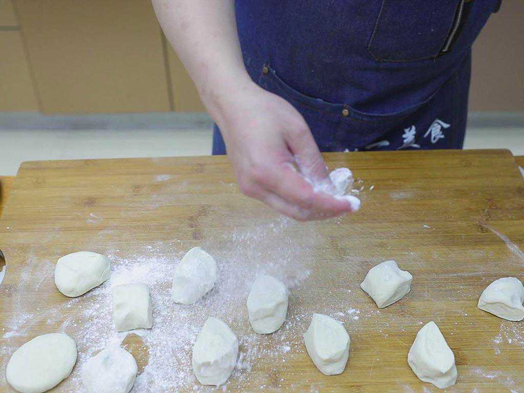 3、开始处理醒好的面团:先案板上撒上底面,把面团取出来搓成光滑的长条,再切成大小均匀的面剂子,面剂子上撒上面粉防止粘连,摁压成面饼再用细布或者保鲜膜盖住防止受风变干。然后把面剂子擀成边缘薄,中间厚的面片。