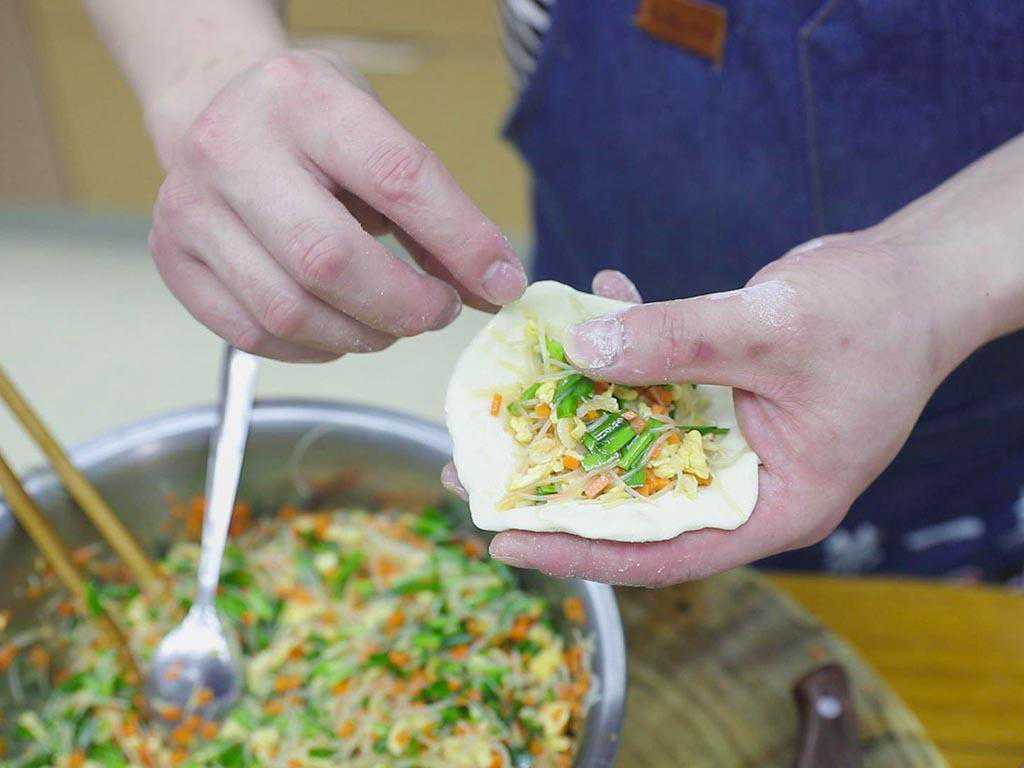 6、现将玉米面和高粱面分别包成一个一个独立的饺子形状,在面皮上放入一勺馅料,把面片对折,用大拇指挤压成饺子的形状即可。
