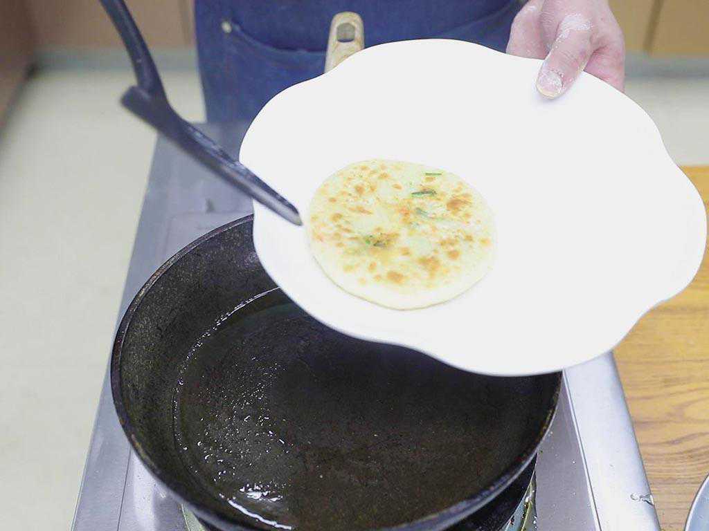 5、平底锅烧热加入适量的植物油润锅,把韭菜饼的生坯放进去开小火慢慢煎,边缘微微变色以后翻面;大约煎1分钟馅饼微微鼓起来以后再次翻面,来回多翻几次面,韭菜饼煎制两面金黄以后即可出锅。