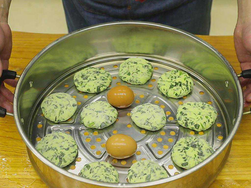 2、然后我们就要起锅烧水,在笼屉上均匀地涂抹一层油放粘。在案板上撒点面粉,整理一下面团。将面团揪成小剂子揉圆按扁,整理成稍微厚一点的小圆饼放到笼屉里。水开后上笼旺火蒸15分钟,另外再放两个用来调酱的鸡蛋一块蒸。