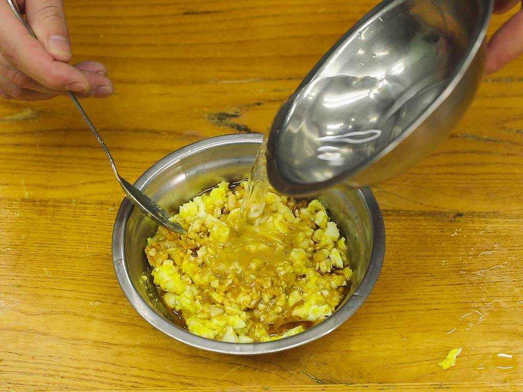 3、开始调蘸料汁:准备一些大蒜和蒸熟的鸡蛋一块捣碎,加入生抽、陈醋、小磨香油、再倒点凉白开谢开,蘸料就完成了。蒸好的菠菜饼蘸着料汁吃,美得很呀!