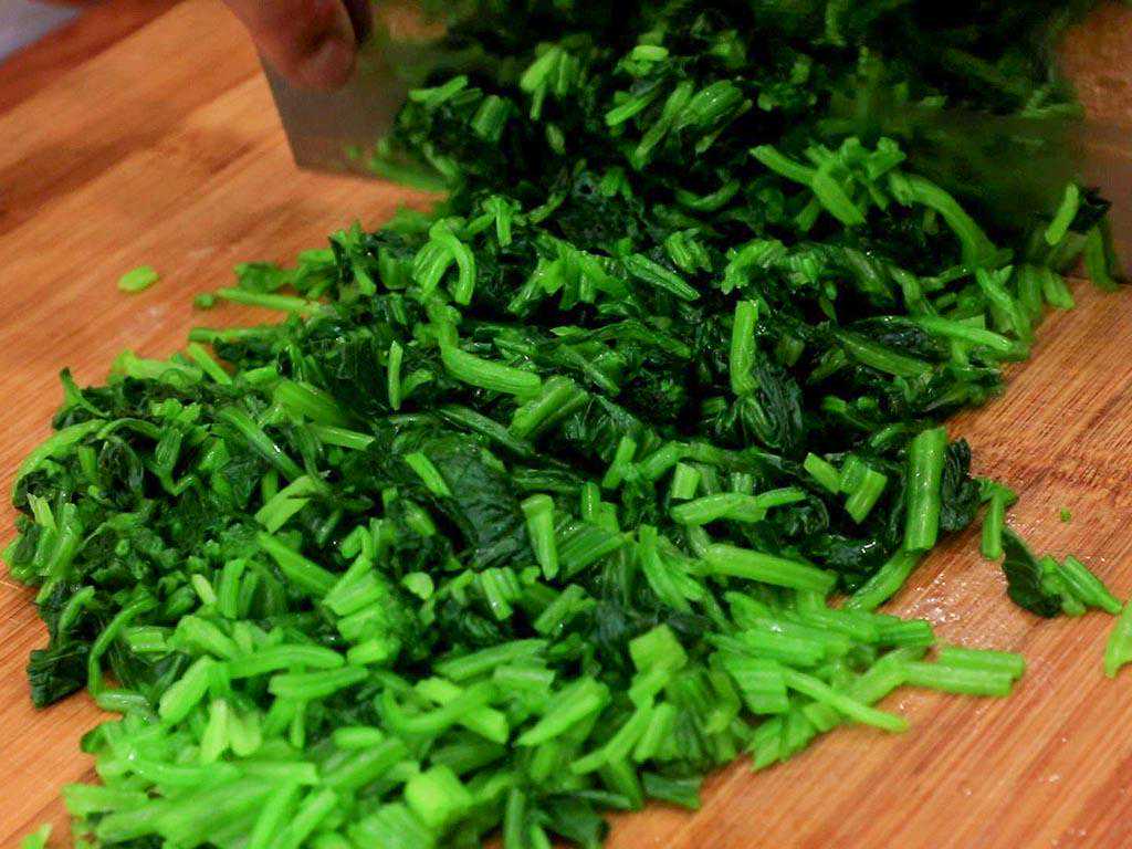 3、和好面团,我们就可以准备馅料了。先把菠菜在开水中焯水30秒,去除草酸。过凉水快速冷却后攥干水分,再将菠菜切成碎末备用。