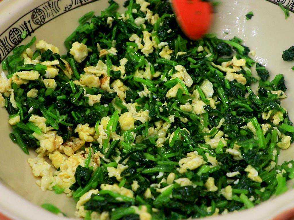 4、碗中打入3个鸡蛋打散,锅内烧油,油烧热以后把蛋液倒入锅中,用筷子快速搅拌成鸡蛋碎盛出放在菠菜盆里。在馅料里加入食盐2克、鸡粉2克、十三香1克、蚝油5克增鲜、芝麻香油5克搅拌均匀备用。