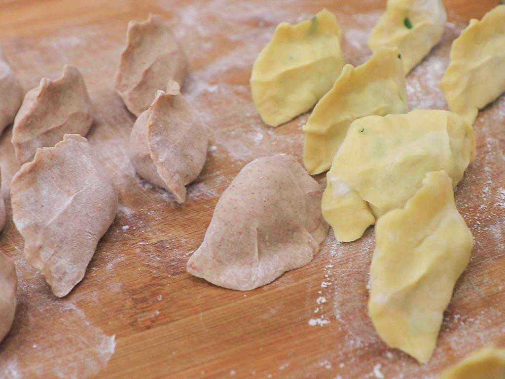7、全部包好以后,我们开始做造型。将两种不同颜色的饺子首尾捏合在一起,再将两种饺子的边缘一点一点地向里折叠捏出花边。这样煎制的时候不容易开裂,也增加美感。