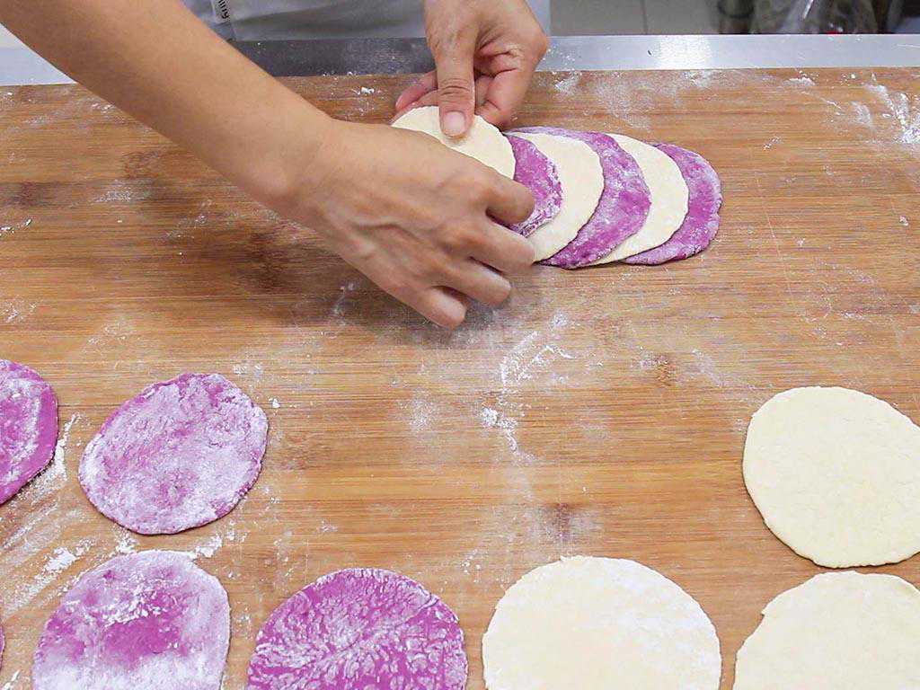 3、40分钟以后,紫薯面团和普通面团都发酵到原来的两倍大。在案板上面撒上一层面粉,分别取出紫薯面团和普通面团,揉搓排出里面的空气。然后将紫薯面团和普通面团都揉搓成一个长条,切成大小均匀的小剂子,接着都擀成饺子皮大小的面片。