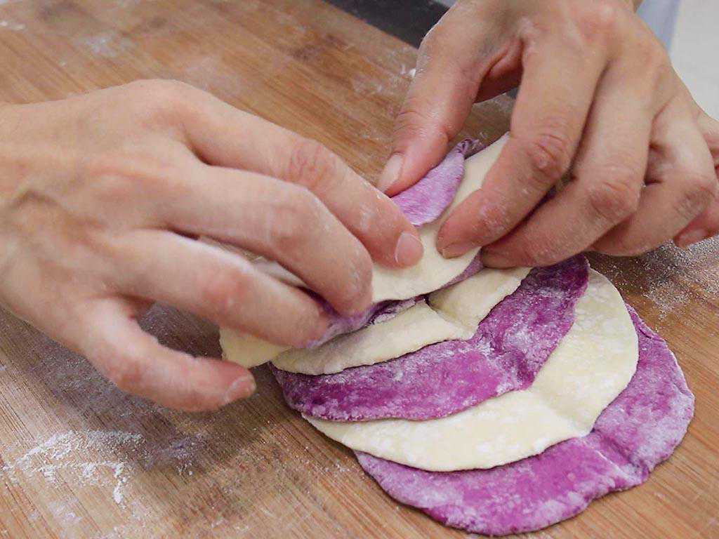 4、把擀好的紫薯面片和白面片交替摆放在一起,六个面片依次插花摆放,用一根筷子在正中间压出一道线来,接着把面片卷成一个卷。