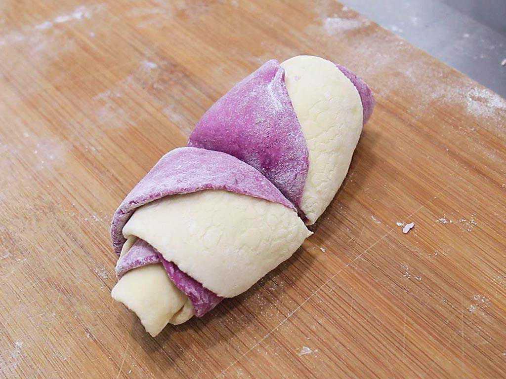 提示:和紫薯面团的时候,不用再加水,四个小紫薯加100克面粉,慢慢揉搓成面团。
