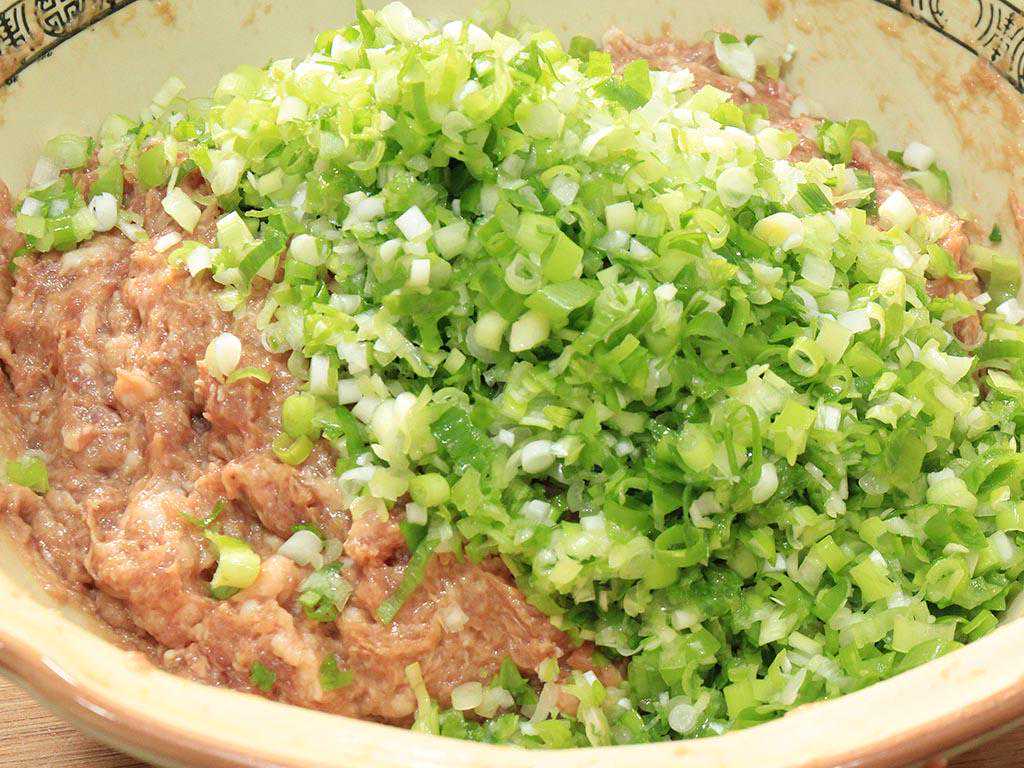 3、馅料开始调味:盆中加入食盐3克、胡椒粉1克、花椒粉1克、生抽10克、老抽2克再加入葱姜泥,搅拌均匀然后朝着同一个方向不停摔打3分钟;当搅拌出馅料的胶质,呈粘稠状时打入一个鸡蛋,淋入芝麻香油5克,适量的大葱切成葱花放入肉馅中,继续朝一个方向搅拌上劲即可。