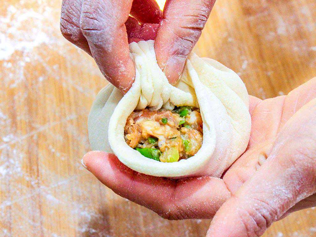 4、当面团发酵成原来的两倍大,且里面都是蜂窝眼。我们在案板上撒底面,取出面团反复揉搓排净空气,面团搓成长条,揪成大小均匀的面剂子,再把揉好的面剂,擀成中间稍厚、边缘稍薄的面皮,放入馅料,捏出褶皱,包子的生坯就做好了。