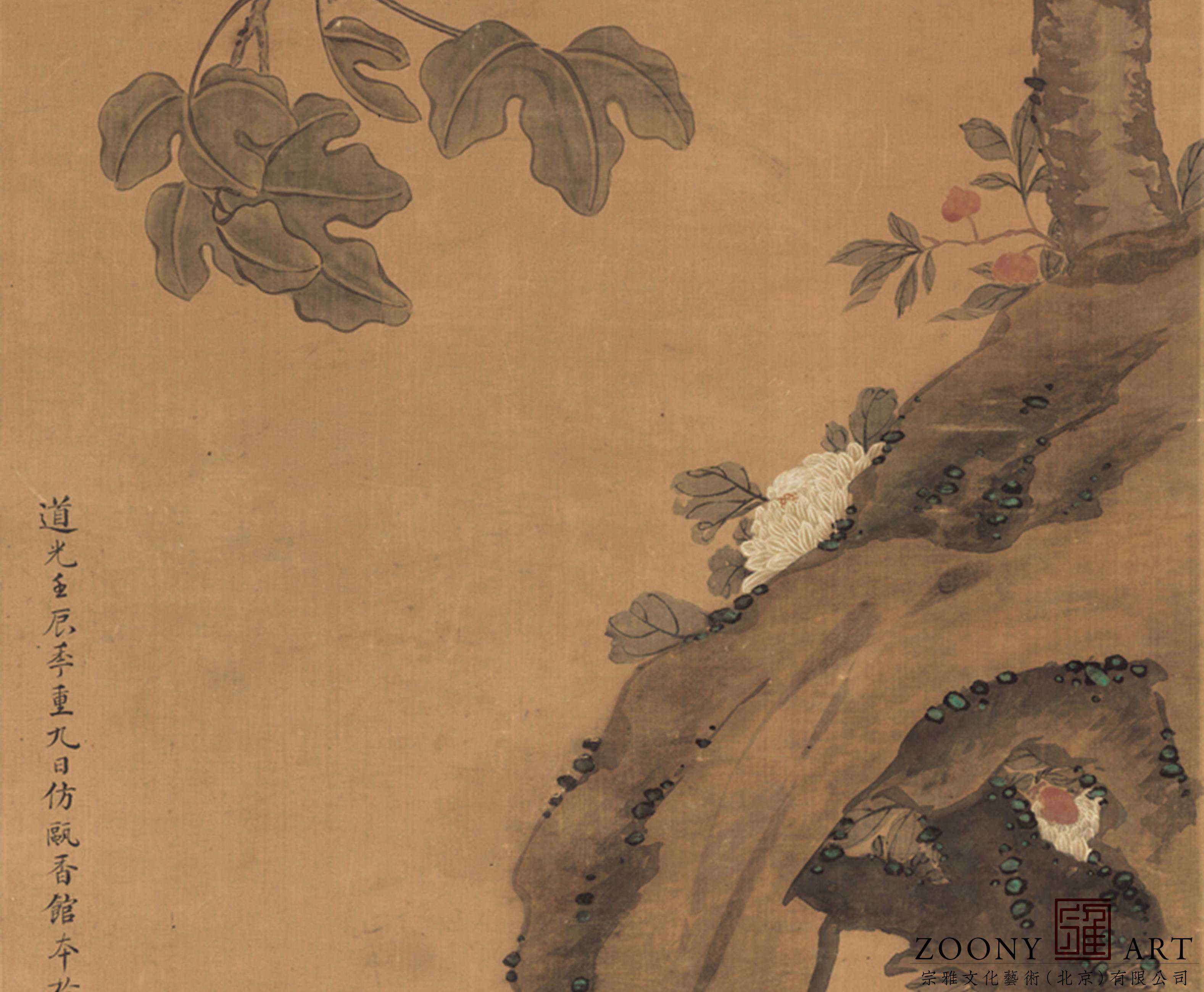 左下自题“道光壬辰季重九日仿瓯香馆本于天光云景斋。阙岚”。钤“臣岚印作”、“小龙眠山人”印。右下钤“延年益寿”印。可以看出,这幅画是作者对长寿的歌颂。