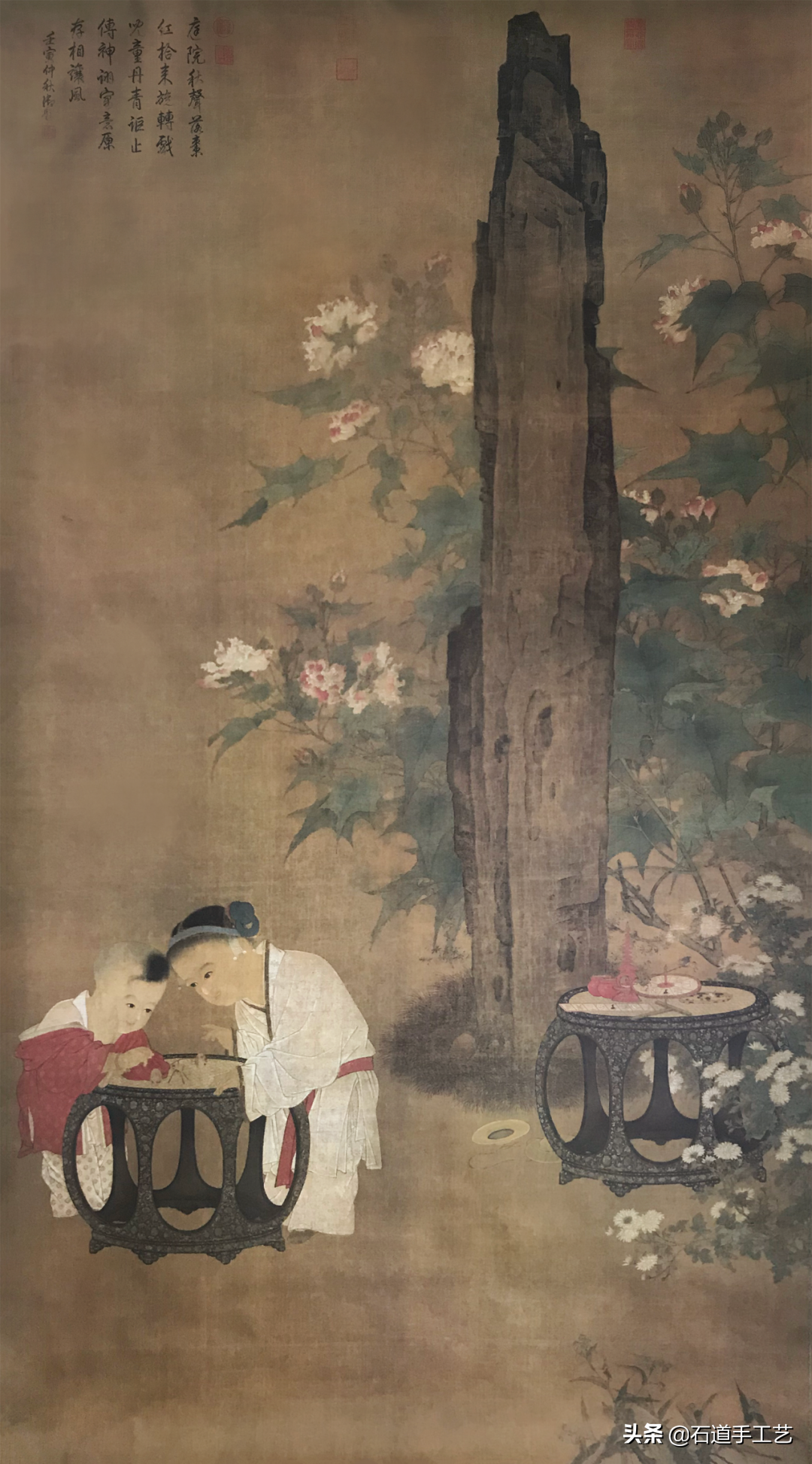P57苏汉臣秋庭戏婴图挂轴/绢本‧设色