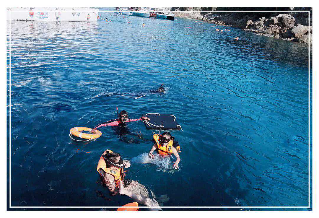 这次出海航行我觉得最好玩的就是「浮潜」项目,在一日游行程的后半段,导游会安排大家带上专用的浮潜工具「下海」