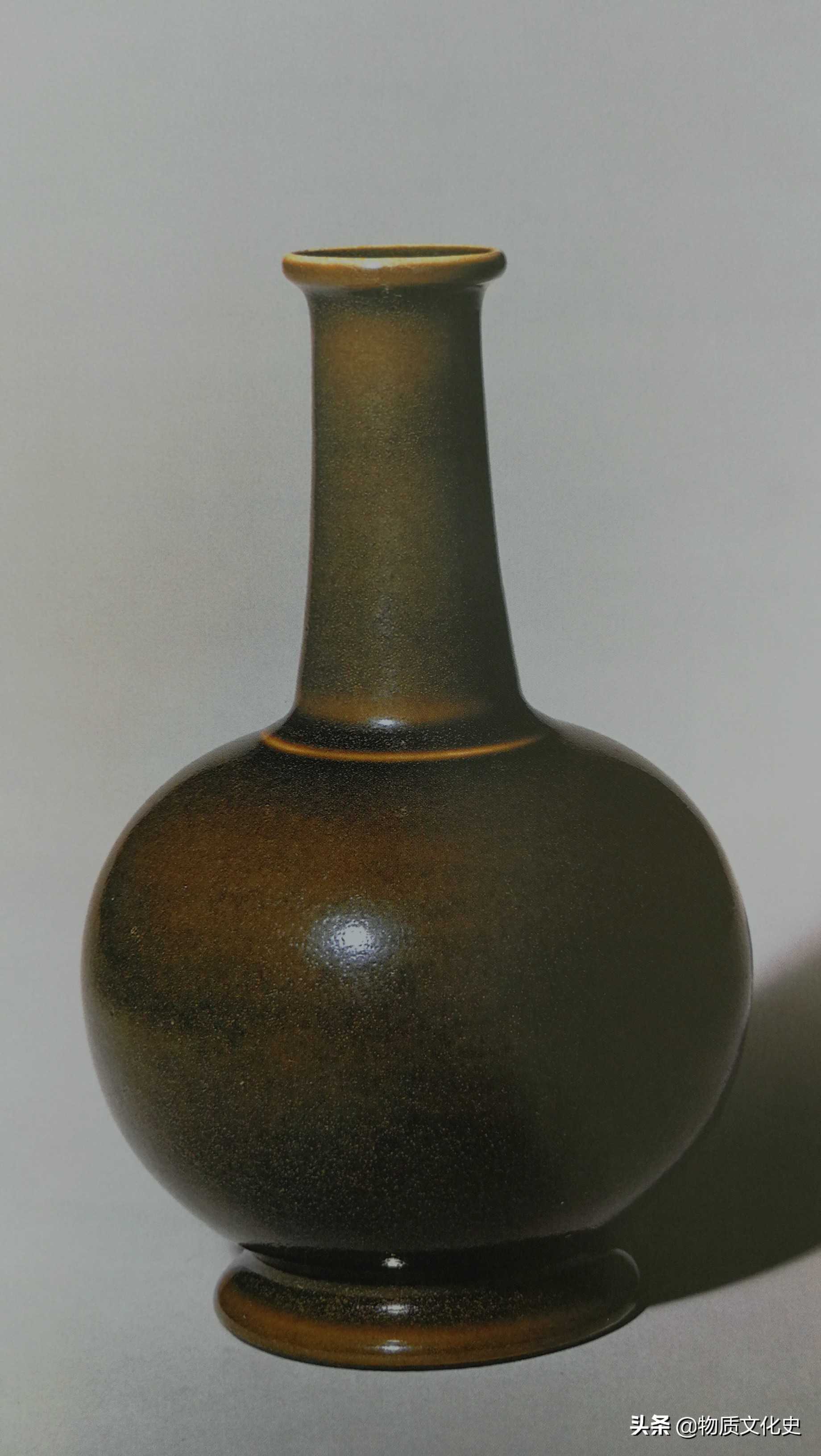 厂官釉贯耳瓶,清雍正时期所制,高9.2厘米,口径3.1厘米,足径3.9厘米。清宫旧藏。厂官釉是中国古代铁结晶釉中的重要品种,其名称始见于清代,其色有鳝鱼黄、油绿、紫金等色,直隶厂窑所烧,故名“厂官”。多缸、钵之类,釉泽苍古,配合诸窑另成一家。