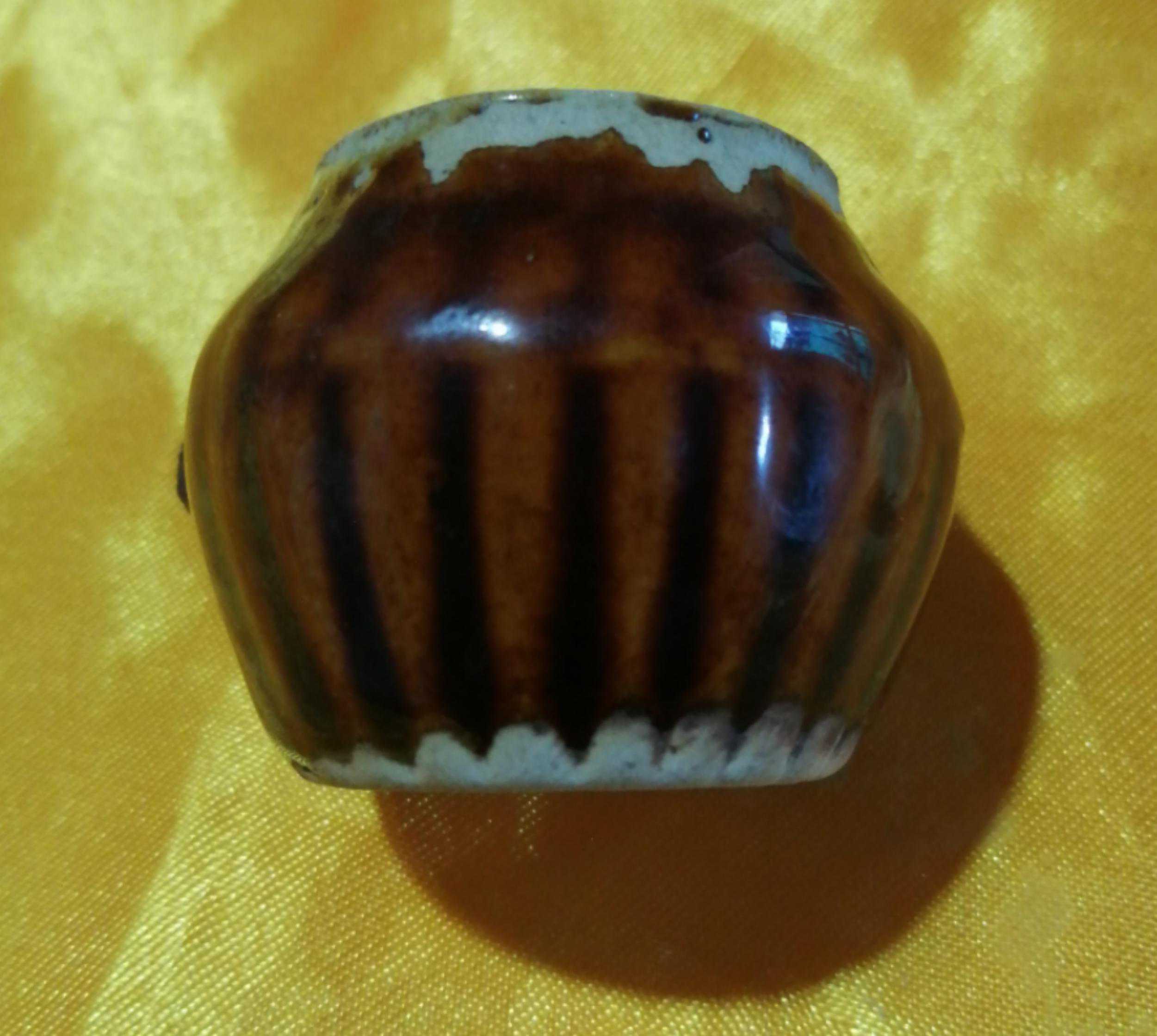 我的酱釉带绿色底的鸟食罐很漂亮!由于时代的久远,拿起来轻的像鸡毛,底部有水沁的痕迹,是明早期的造型设计,能工巧匠从鸟食罐的口沿用直线雕刻到罐底的装饰艺术,大大提高了鸟食罐的颜值。