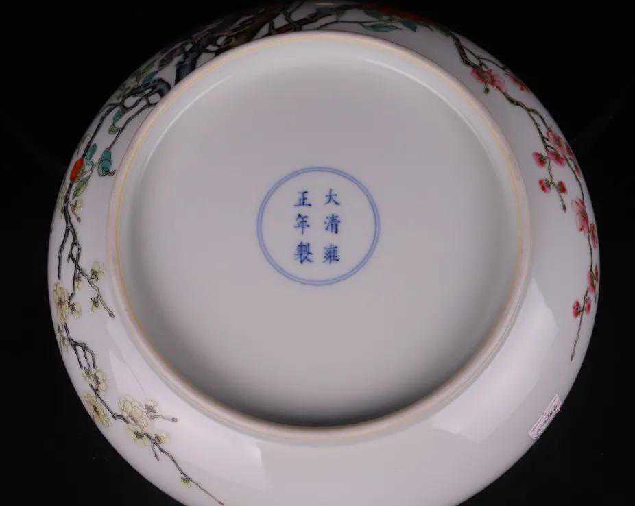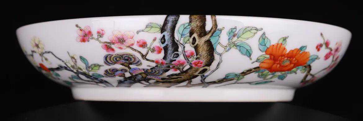 下面就让我们一起欣赏这件清雍正粉彩过枝梅花月季纹盘,口径26厘米、高5厘米、底径17.5厘米,胎质坚致厚实,釉汁白胜霜雪,细腻莹润,彩绘红梅、白梅、月季三枝由外壁攀延过盘边伸展铺陈于盘心,梅树屈曲横生,枝头吐萼含苞,各具意态,月季风姿绰约,与梅花高低呼应,蜜蜂欲落还飞,于一动一静中平添野趣。画面清秀细腻,设色淡雅,双蜂细处妙入毫颠,寒梅画为五瓣单层,红梅萼片以矾红彩敷染,花瓣略染胭脂红,白梅萼片以绿彩敷染,花瓣填绘玻璃白彩,两者对比鲜明,极为清雅,尽显梅花的劲峭冷香,更以丹青妙笔皴染出灰褐的枝干,点染青苔,苔点为绿釉上加染白料,形成苍雅浑厚之感。灵芝二朵寄生梅干上,厚实茁健,外壁一侧红白二梅俯仰生姿,相映交辉,月季绽放飘香,风情无限。整体布局巧妙,梅花月季于器足上攀,延伸过壁至盘心,连续不断,使内外图案既独立成章又浑然一体,构思之精令人惊叹,底足施有护胎釉,底部中心青花双圈款,内书“大清雍正年制”六字三行楷书款,整件藏品,细细品鉴,为雍正粉彩瓷的上乘佳作,极具收藏价值。