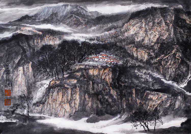 中国画,向以言志抒怀为特点,他的笔墨点线之间充满了人文精神与情怀,所以,在画面上呈现的不再是客观世界的“存在自然”,而是主观世界的“内心自然”,如此,中国画艺术形成了讴歌“人与自然”母题的永恒精神文本,并在精湛、独特与虚拟的空间结构中,“写意”着千古梦境、无限乡愁和灵魂象征。我看于仁祝的作品,却有如此感觉。于先生画山水,气势磅礴,意象表现,坦荡磊落,清峻苍茫,显现了画家的气质、秉性与品格,因为,只有在思接千载、视通万里的精神高度上,才能如此立象尽意、遥情寄物的自由胸怀,在有限中表现无限,并化实为虚,化形为神,以内美修能取胜,使笔端山水、花鸟升华为人格、精神象征,用以传达生命之音。