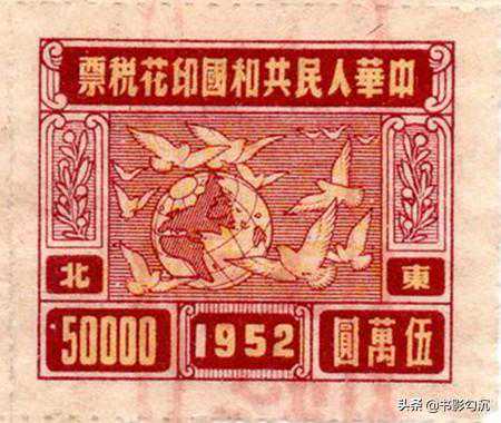 第二个是“鸽球图”,主图为面值5000元至50000元的和平鸽环绕地球图案,下方同样也有“1952”字样。