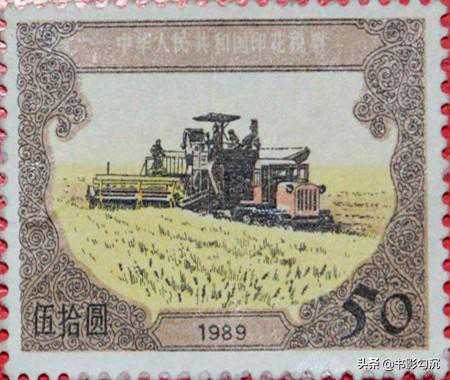 二、第二套印花税票1952年7月1日,国家财政部税务总局发行了建国以后第二套印花税票,与1949年版一并通用。第二套印花税票分为两种:一个是“机器图”,主图为面值10元至2000元的拖拉机、压路机、发电机图案,下方有“1952”字样。