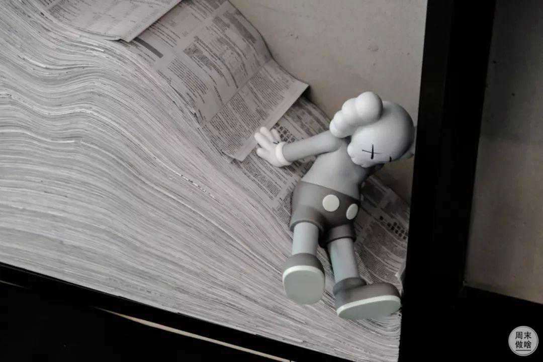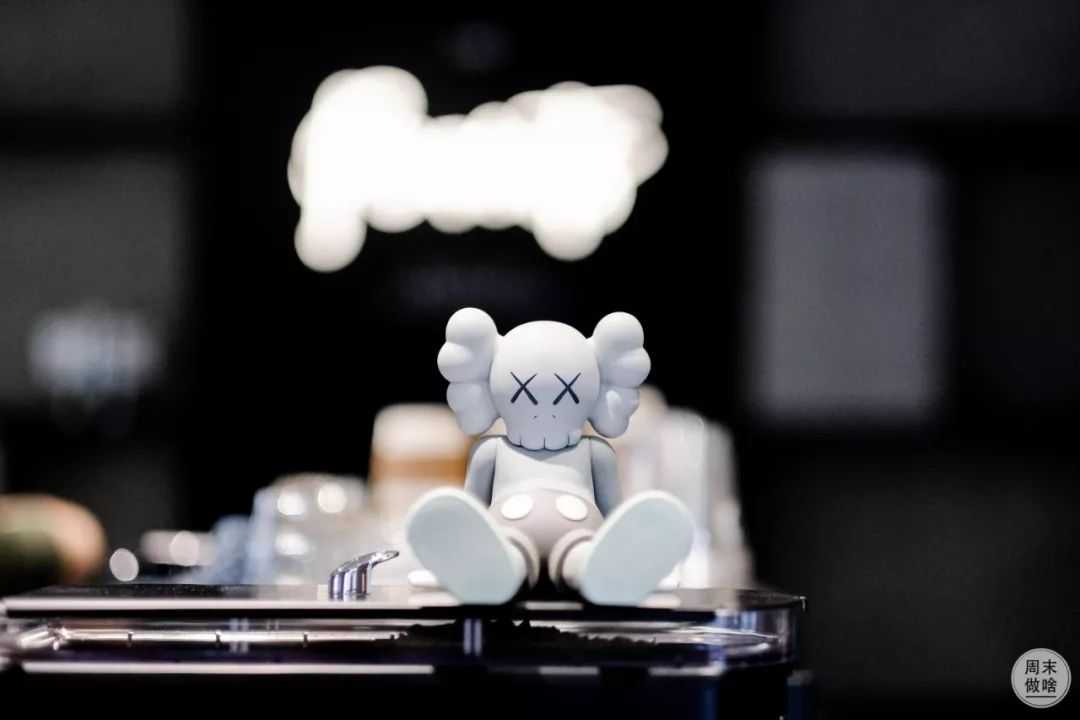 店里挂有店铺logo霓虹灯的一面墙的布置很特别,每个隔间中是用一张张报纸堆积成的几何状,再加上kaws玩偶,是相当有个性。