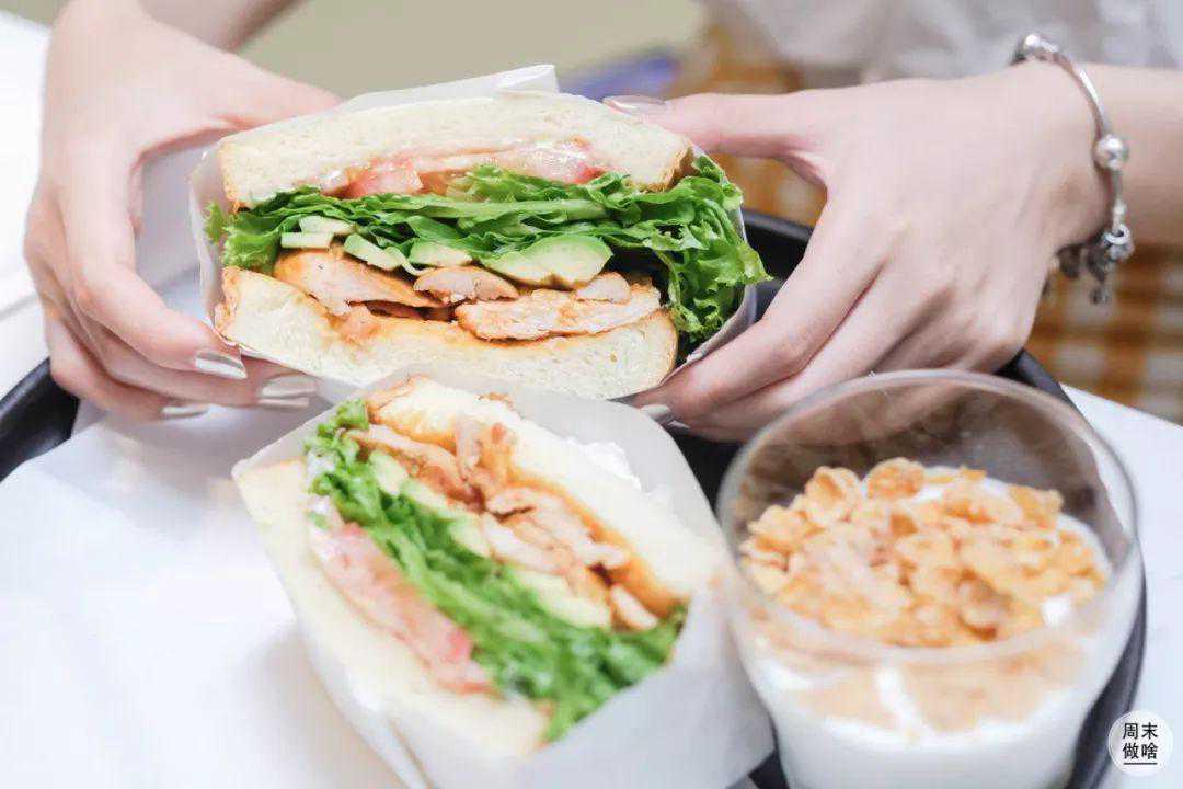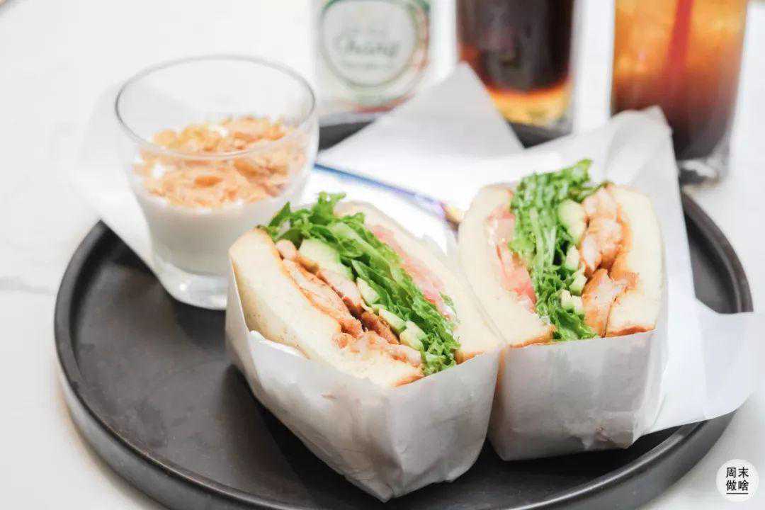 这款鸡肉三明治小怪是要实名制为它打call哒~首先量就很足,即便被切开成两份,都能感受到它的厚实。鸡肉很嫩,生菜很新鲜,面包也是松软的口感。关键是,还配上了一份酸奶麦片。