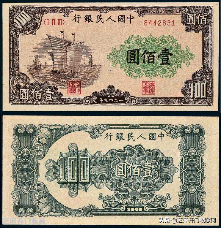在1949年新中国成立之后,就由中国人民银行在1950年1月30日,发行了我国的第一套人民币,其中面值为100元的大帆船纸币,是这一套人民币中面值最小的纸币了。其纸币主要是由重庆印刷厂,采用胶印四色的印刷工艺技术印刷而成。大帆船100元纸币的正面图案为一个左侧的帆船,其颜色为黄棕色;而纸币的背面则为墨绿色的花符。这枚纸币的长为132mm,宽为69mm。在1955年的5月10日后,由中国人民银行宣布这枚纸币停止流通,也是在这一天,大帆船100元纸币正式的退出了我国人民币的流通市场。