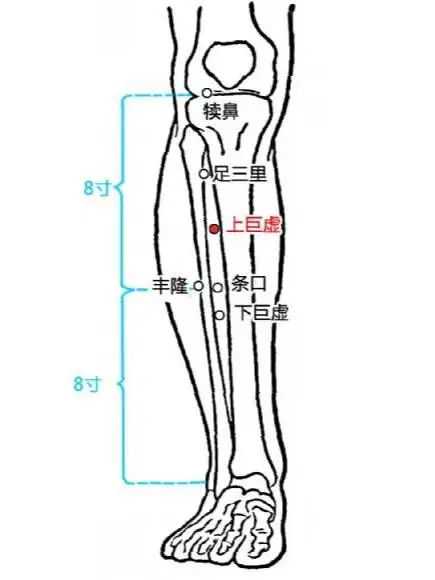 上巨虚同属胃经,为大肠的下合穴。可以由上巨虚向足三里方向用力推按数分钟,推时有痠胀感,部分人会立即嗳气或放屁,是脾胃滞气得以推行的效果。