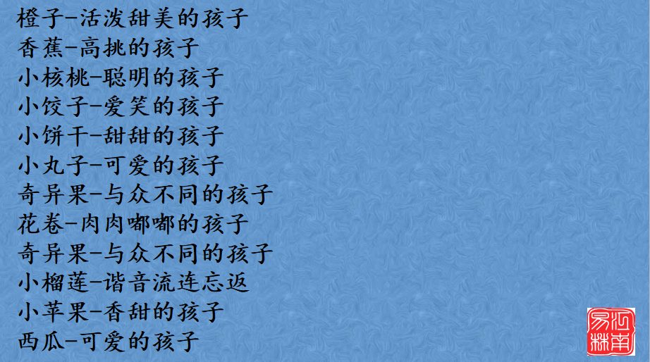 抽取大名中的单字作小名,这个方法应该是目前用的最多最为普遍的方法,比如使用频率最高的“丽丽”,“婷婷”,“明明”,“涛涛”等已经耳熟能详了。江南易林之所以单独挑出来说,还是因为简单,但简单中不俗气,还是需要花一番心思的。