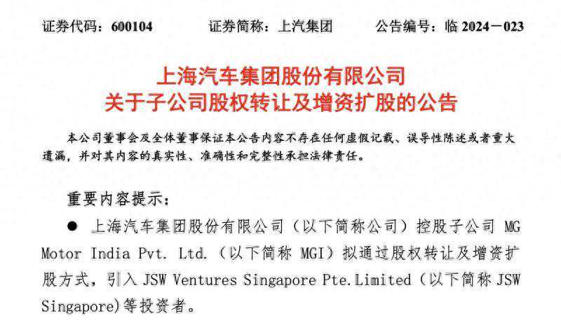 新京报贝壳财经讯(记者林子)4月7日,上汽集团就MG印度公司发布公告显示,继去年底与印度钢铁巨头JSW集团签署战略合作协议后,近日,上汽集团已收到JSW支付的265亿卢比股权转让款。