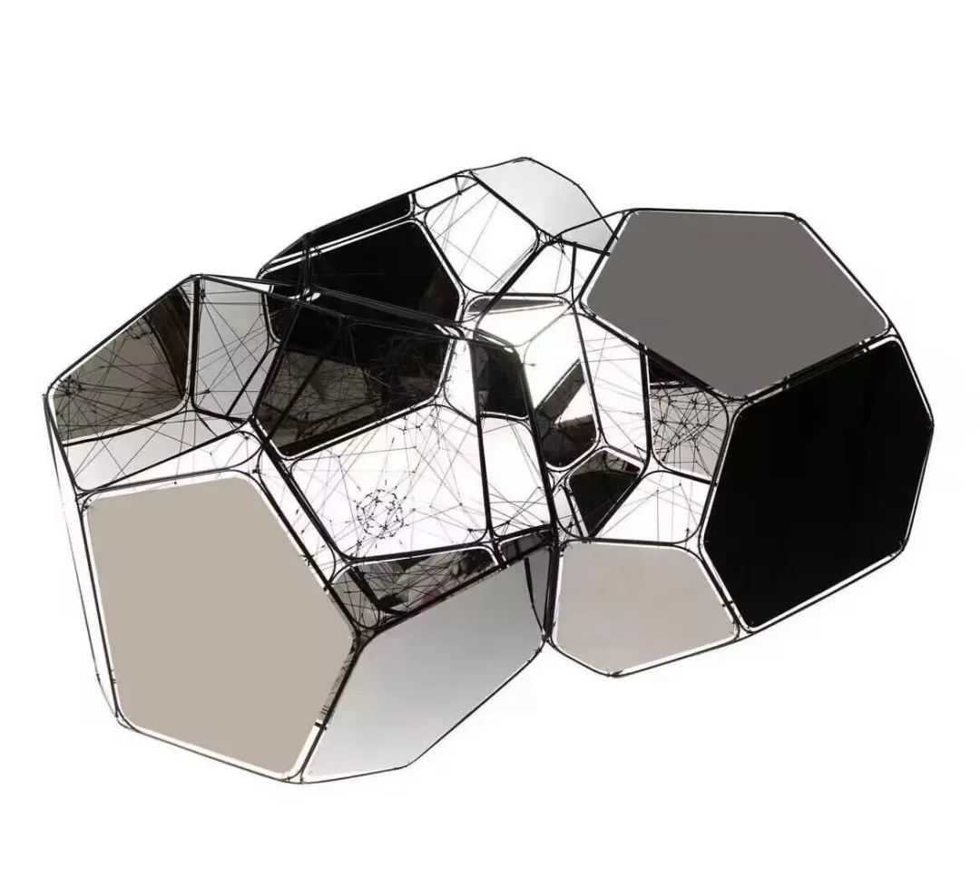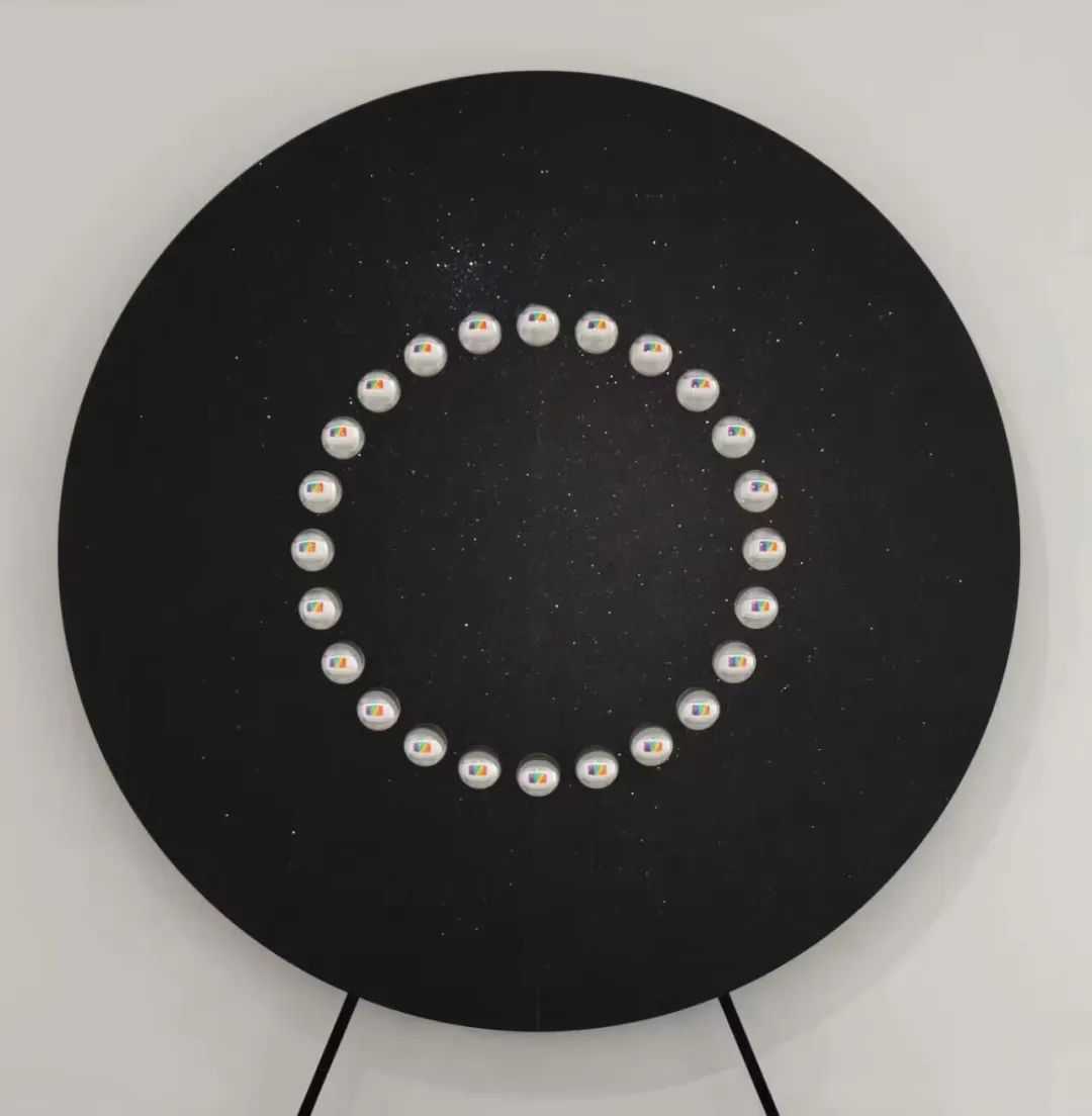 3米高的金属盘上有亮光粉,周边有24个水晶球体,反射出周边物象的倒影