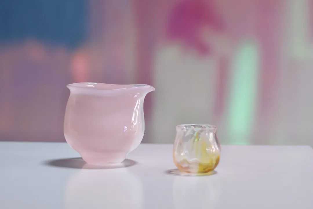 历经不同的炉温,通过吹制,研磨,铸造等多种方式,达到色彩的鲜度与融合度,不仅生成蜜桃粉、青梅绿、黎明紫……等等独特的色泽光韵,亦有通透又温润的手感。何飞有感于“贵人从贱业,贱业不贱。”琉璃手作也不再只是少数人的珍藏。识云Gallery融合了当代艺术与传统手工艺,在展览中呈现出了一种全新的视觉风格。识云Gallery系统的梳理了琉璃发展的历史,同时以琉璃为材料媒介策划了多位国内外艺术家的展览。识云琉璃的茶道具做到了极致的薄胎,塑造了水的形状,同时也挑战了手工艺的极限。识云茶道具的艺术性在于,既有西方水晶的通透性,又有中国如云似玉的润度,和中国陶瓷的色釉体现。这些都是琉璃手作大师在漫长岁月的洗礼中,突破原本材料和工艺的局限,形成与当代艺术的“融点”。