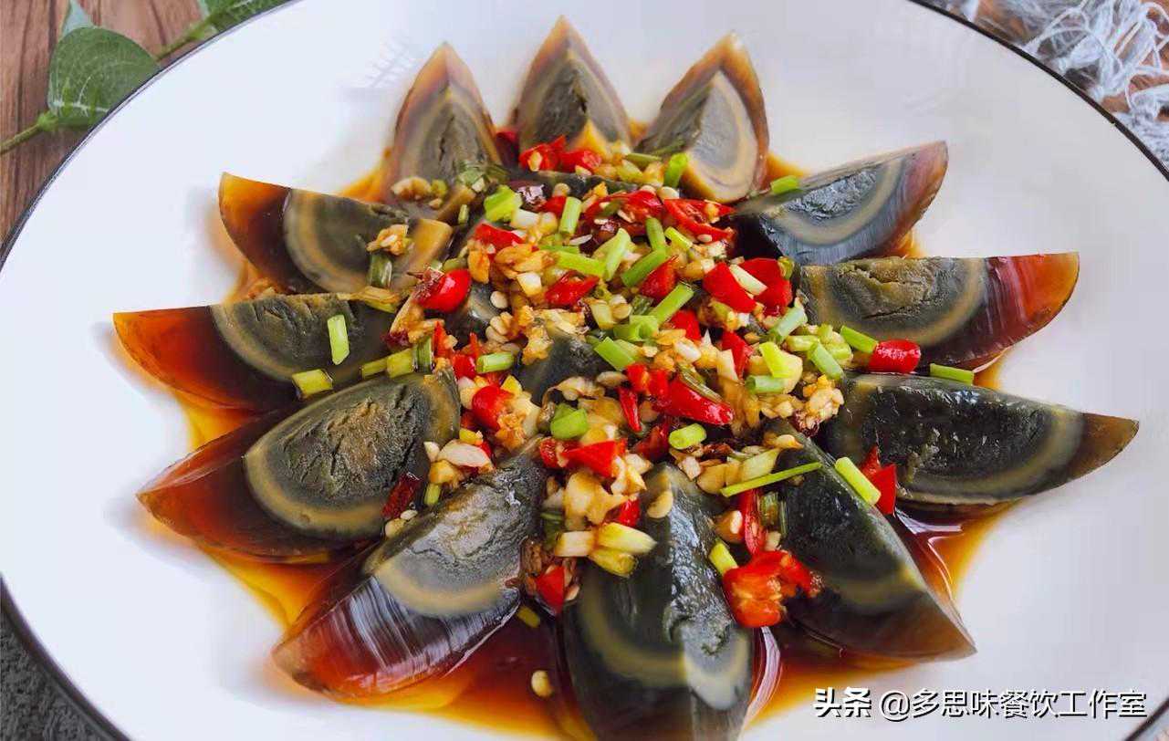 1皮蛋剥壳洗下,切成四小半摆盘。蒜剁碎、小米辣、小葱切碎。