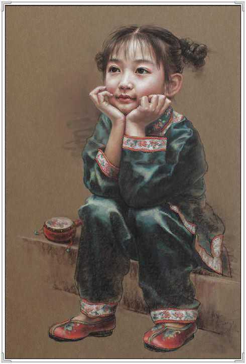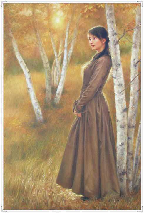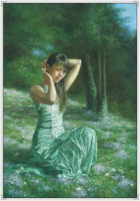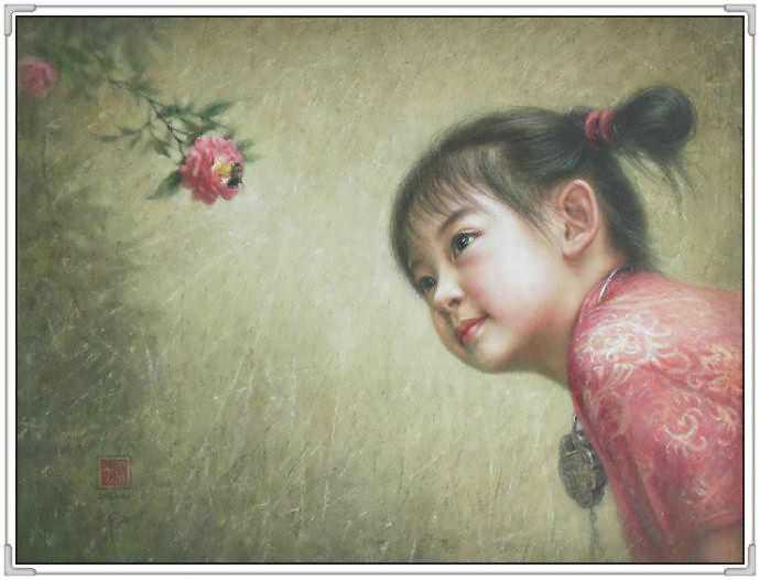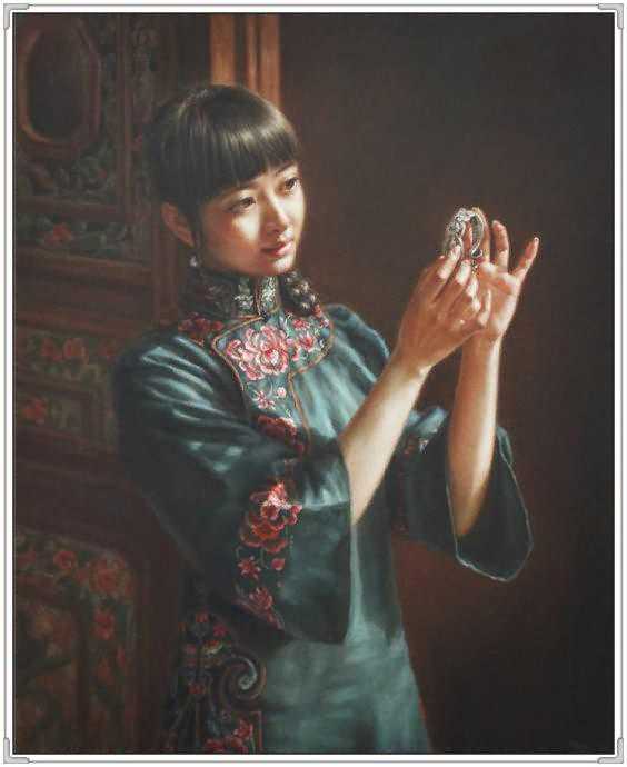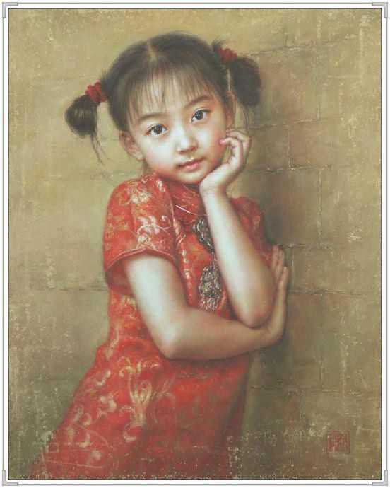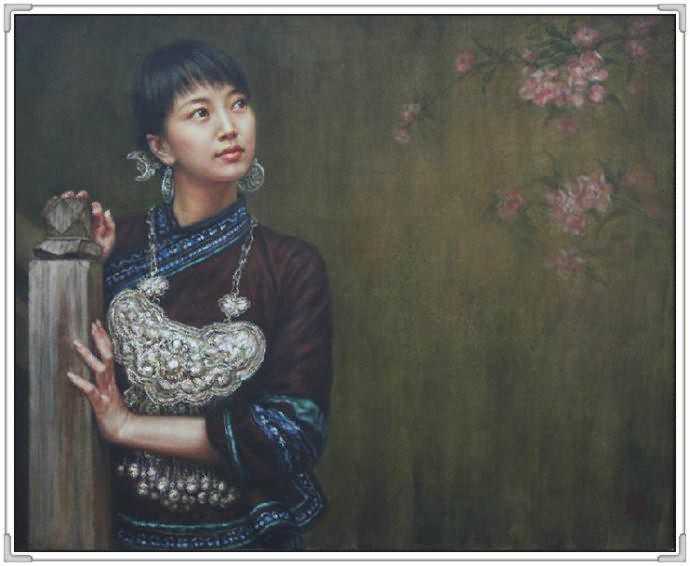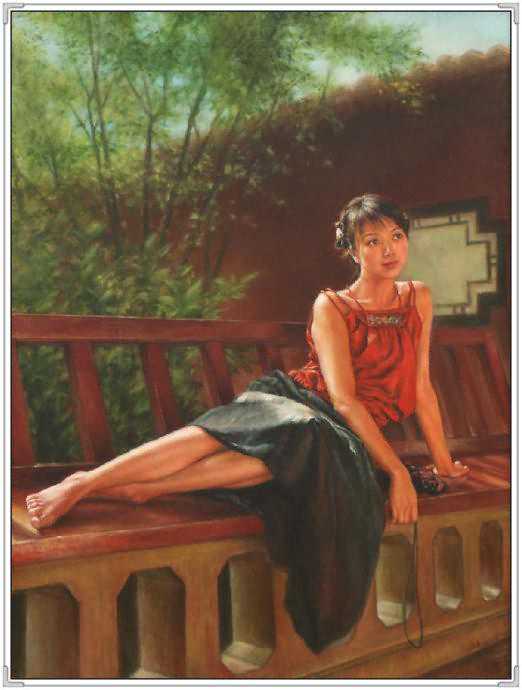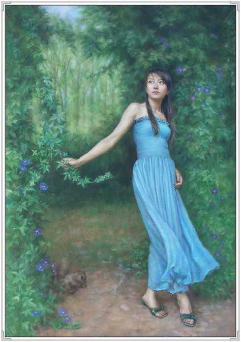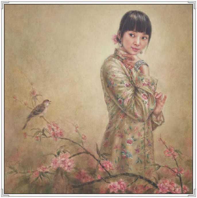 这幅作品中,女孩的衣着古典,红色的绸缎的质感,和布老虎的喜气相得益彰。展现出豆蔻年华的俊美。她轻轻的倚着头,眼神温柔。似乎憧憬着未来和远方。背景处理的非常简练,又充满神秘感。纸张老旧的桌子更是衬托出年轻人朝气。可就是这样的朝气,在徐小稀的笔下,却显得那样的安静和美好。似乎,青春,就是优雅。我们就是这样确实的感受到徐小稀的唯美世界。一切都是优雅和宁静的代名词。这一袭旗袍的女子,仿佛让我们回到了印刷车间。这是读书的时代,也是安静的季节。这个季节适合做一个唯美的女人,画一张唯美的作品。在这幅画中,我们可以感受到一代文豪,一代才女的精神面貌。稳重,清新,又有着那样浓郁的生命的气息。一棵古树,一片花海,雅致的建筑,和从远方走来的女人。