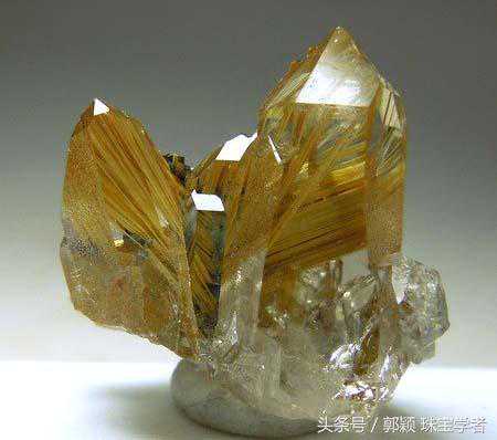 金发晶的内部“发丝”多杂乱无章排列,只有极少数品种的发丝沿同一方向的排列,被称为顺发。同时顺发的发丝多粗壮、笔直,形成板块状,在充足光线的照射下,呈现金光闪闪的效果,异常美丽,因其内含物为氧化钛物质,因此也被为钛晶。钛晶是发晶中价格十分高昂的品种之一。
