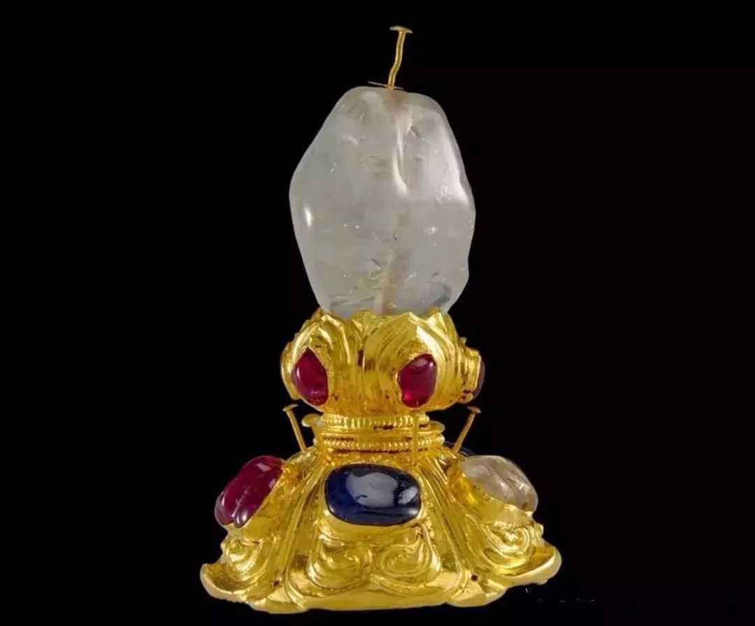 由金镶宝石莲花底座和蓝宝石顶饰组成,出土时存宝石10颗。座顶端“拴丝镶”一颗近200克拉的橄榄形无色蓝宝石,是目前考古发现最大的蓝宝石。