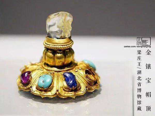明梁庄王墓是明仁宗朱高炽的第九个儿子朱瞻垍与魏妃的合葬墓,出土金器、玉器、瓷器等5300余件,出土文物各种镶嵌的宝石有700多颗,是中国已发掘明代亲王墓中等级最高的一次,随葬物品的丰富与精美仅次于明十三陵中的定陵。在明代梁庄王墓出土有六件帽顶。